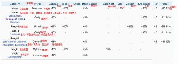 所有的魔法武器(消耗魔法的)都可以取得以下前綴,其中魔法豎琴?zèng)]有擊退能力,所以它最好的前綴是Mystic神秘的或者Demonic惡魔的,其它魔法武器的最好前綴是Mythical神話的