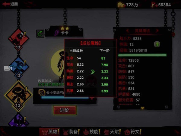 英雄進階:英雄進階可以提升英雄的成長屬性,即各屬性的成長值;
