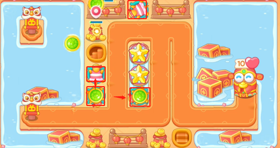 1、開局我們在圖示位置放置兩個滿級烏龜,等水中出現木板之后繼續放置烏龜,優先把箱子打出來給的是星星。
