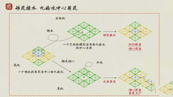 最直白的例子,就是湖心荷花的復(fù)制粘貼無限生產(chǎn)大法,流程如上圖所示: