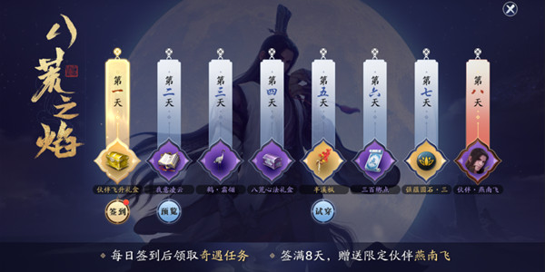 八荒之焰燃起,首日登錄即領俠影招募令,次日登錄領取大輕功“我意凌云”,五日登錄領永久背飾·半溪楓、八日登錄即可獲得伙伴·燕南飛!