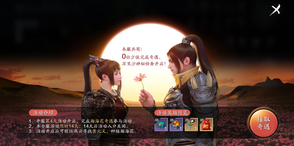 開服第4天將開啟瀚海花活動,請少俠務必為離玉堂和韓瑩瑩的婚禮助力!瀚海花開滿大漠之日,便是離玉堂和韓瑩瑩的大婚之時。少俠們也將得到永久外觀【萌趣·離盟主】、大量綁點和養成材料。