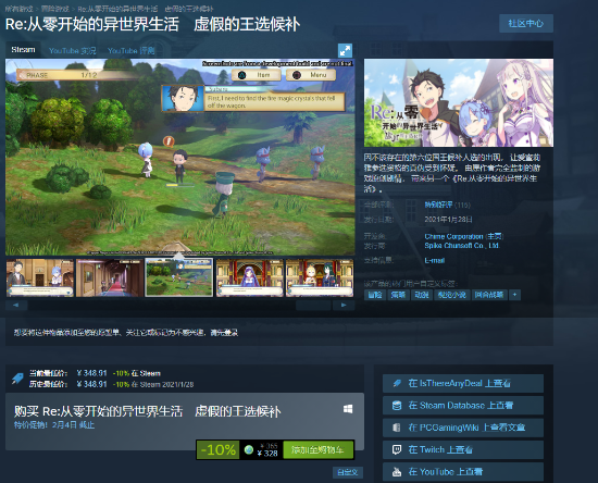 《Re:從零開始的異世界生活-虛假的王選候補(bǔ)》已于昨天正式發(fā)售,Steam版售價365元,首發(fā)折扣價328元。