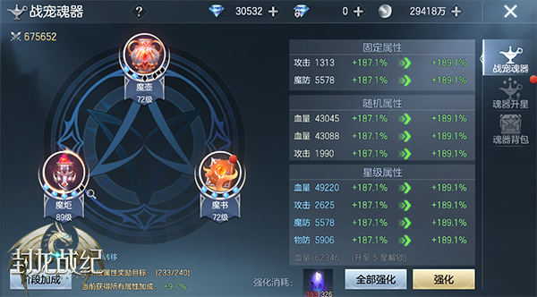 在本次更新后新增的戰寵魂器系統中,可以讓玩家攜帶戰寵裝備,進一步強化戰寵的屬性。戰寵裝備分為魔壺、魔書、魔炬三種,需要角色達到特定等級才能相繼開啟裝備欄。魂器還能通過強化、升星等方式增加屬性,讓戰寵的能力更強。集齊三大魂器,讓戰寵們成為更可靠的旅行伙伴!