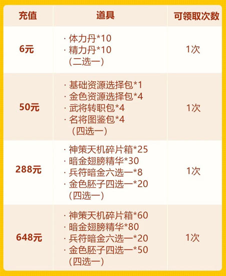 少年們單筆充值指定金額,即可得到神策天機(jī)碎片箱、暗金翅膀精華、兵符暗金六選一、金色胚子四選一 等珍稀道具!并且可以和歡慶佳節(jié)中的充值活動疊加,少年們千萬不要錯過喲~