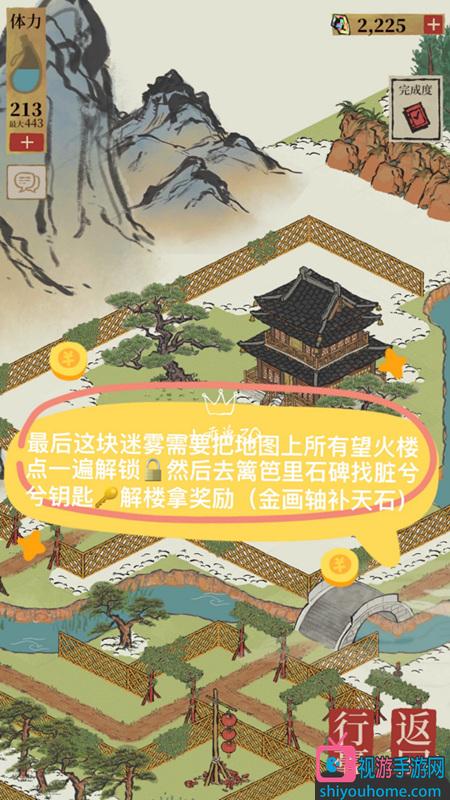 江南百景圖限時探險活動中的小樓鑰匙在石碑里,想要拿到鑰匙,需要先把地圖上所有望火樓點一遍解鎖,然后才能去籬笆里石碑找臟兮兮的鑰匙,解鎖樓拿獎勵,有金畫軸和補天石哦。