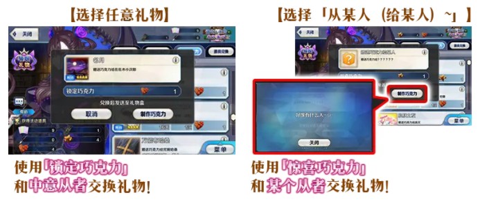 鎖定巧克力為單獨選擇某一位從者的巧克力禮裝兌換,驚喜巧克力則是隨機。