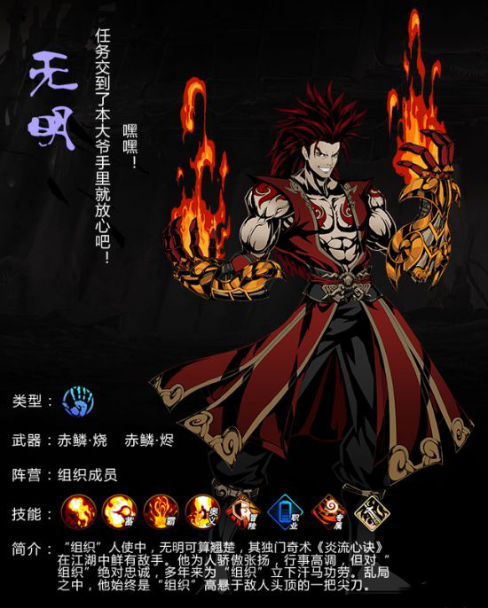 作為組織成員的無明,一手火炎技能可謂是翹楚。在獲取方式上很簡單,只要提升到特定的段位,就能得到無明。雖然實力不及他的好友五水,但霸體能力也給予了他不小的威力,另外,第二個蓄力技能如果用得好,也能對敵人造成致命的威脅。