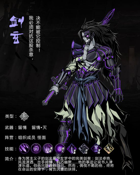 劍玄是一個改造人,外表不是很好看,但在游戲中確實男二號的地位。劍玄的屬性是無,特點是封印技能的效果、蓄力霸體以及全屏大招。在實戰(zhàn)中,一般使用封技的效果讓敵人無法施展技能,趁機不斷進行攻擊,在pvp中因此常常讓對手十分頭疼。而在刷圖時,遇到一大群敵人,那么就能用霸體抵擋群毆傷害,同時抓準時機釋放大招,清除掉所有的對手,十分高效。