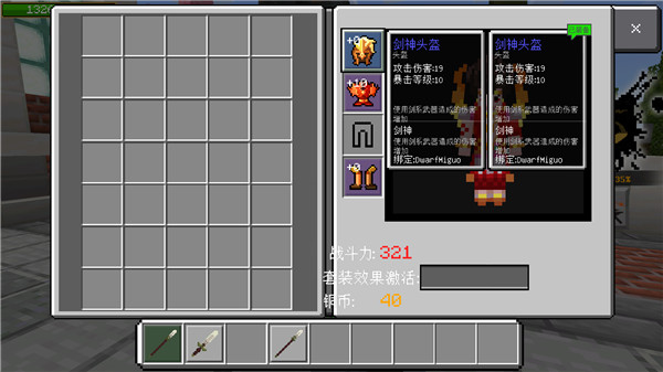 銅錢可以在下一關傳送門旁的商人處購買裝備,商人在當前會出售0/10/20級的裝備,裝備等級越高,則屬性越好。護甲有多種類型,一般來說,劍神套裝會給劍類武器帶來額外的傷害加成,而槍神套裝則會對應的給槍類武器帶來傷害加成。破軍套裝會給冒險者們護甲穿透效果,而刑天套裝會給冒險者們帶來大量暴擊傷害增益。