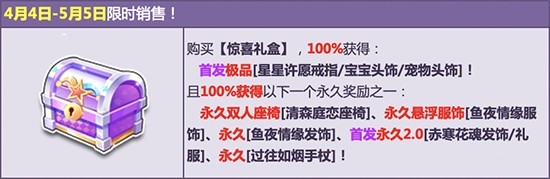 在飛車商城購(gòu)買【驚喜禮盒】,100%獲得首發(fā)【星星許愿戒指/寶寶頭飾/寵物頭飾】!每個(gè)禮包隨機(jī)一個(gè)以下永久極品獎(jiǎng)勵(lì):永久雙人座椅【清森庭戀座椅】、永久懸浮服飾【魚夜情緣服飾】、永久【魚夜情緣發(fā)飾】、首發(fā)永久2.0【赤寒花魂發(fā)飾】、首發(fā)永久2.0【赤寒花魂禮服】、永久【過(guò)往如煙手杖】。