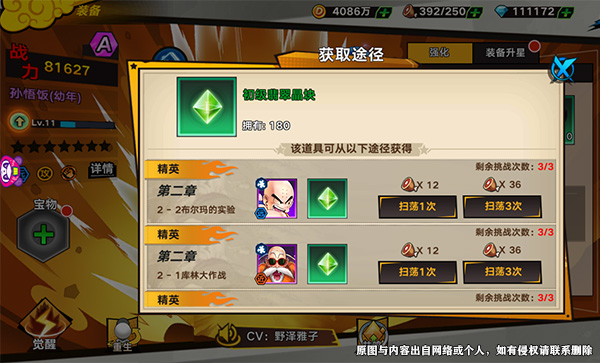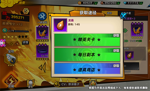 點進角色信息,進入裝備強化界面,點擊右下方的裝備晶塊圖標即可打開簡略的掃蕩頁面,在這里就可以快速獲取裝備升階晶體,順便獲得龍晶,比直接去精英副本翻頁點擊快了不少,幾分鐘就能賺取大量龍晶了!