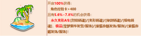 活動期間,【熱帶椰樹】限時銷售!開啟100%獲得:【角色經驗卡+400】,且有5.6%~7.8%的機會獲得:永久變形A車【烈焰銷魂】/【變形銷魂】/【綠劍銷魂】/【銀電銷魂】,極品【瑩夢煙華發型/服飾】/【紫狐彌魅發飾/服飾】/【紫狐彌媚發飾/服飾】,獲得【懸掛系統+1】/【寵物進化包】/【效率寶珠LV1】等物品的幾率為92.2%~94.4%。