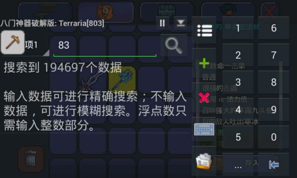 打開八門神器和游戲,無前綴的數(shù)值為0,搜索一個(gè)武器的前綴數(shù)值(如:“大的”數(shù)值為1),再把你要修改的武器或飾品移到剛才那個(gè)格子里,搜索它當(dāng)前的數(shù)值,反復(fù)如此,直到剩下一個(gè)數(shù)據(jù)時(shí)修改你想修改的前綴數(shù)值即可。