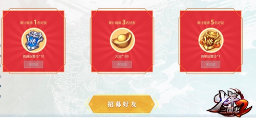 以上就是預約活動的全部福利了嗎?當然不是!《少年三國志2》的高福利不僅如此,邀請你的好友加入同樣也有豐厚獎勵領取!累計邀請好友達到1名好友、3名好友、5名好友,還可以拿到普通招募令、188元寶和高級招募令等道具。一句話,來玩《少年三國志2》的朋友越多,玩家們得到的獎勵也就越多!