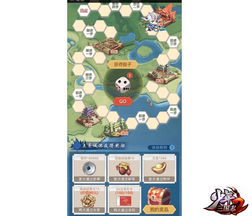 那么玩家要如何獲得獎勵呢?點擊骰子進行游戲,少年會根據骰子的點數前進相應的方格,點亮對應的城池即可獲得獎勵!