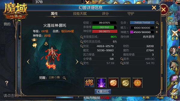 在電影《哪吒之魔童降世》里,相信玩家們對全新造型的哪吒印象深刻,在陳塘關大劫之時哪吒沖破乾坤圈的束縛釋放覺醒之力,無論外形還是實力都炫酷十足。而作為正版授權聯動移植到《魔域口袋版》中的哪吒幻獸,除了極致復刻帥到炸裂的形象之外,魔童哪吒的屬性也十分優秀,它的初始物攻、魔攻屬性已突破極限,副屬性的成長也十分可觀,喪心病狂的高額成長屬性讓哪吒化身摧枯拉朽的烈焰,輕松碾壓全場。