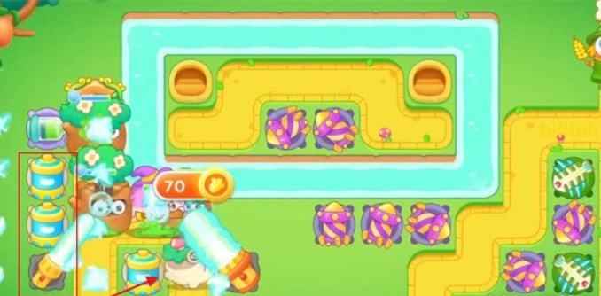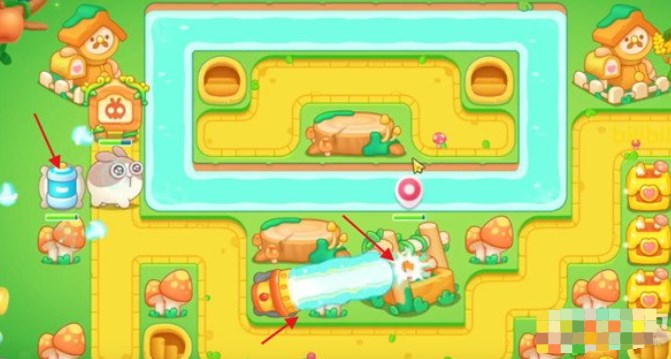 2.在箭頭所示位置放置火箭塔,同時利用火箭塔的高傷害清理掉水中的障礙物。