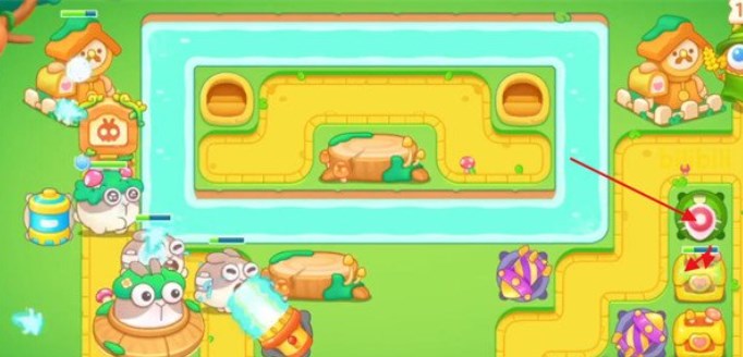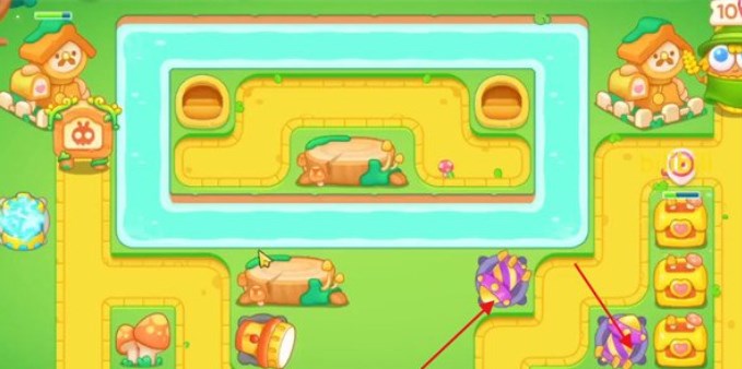 3.將箭頭所示處放置一個蝴蝶結并升至滿級,蝴蝶結的范圍傷害可以快速清理掉下方的障礙物和附近的兔子