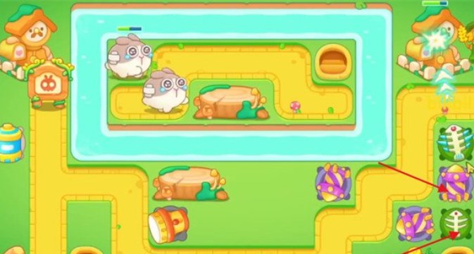 3.將箭頭所示處放置一個魚骨塔并升至滿級,魚骨塔可以快速清理掉下方的障礙物。