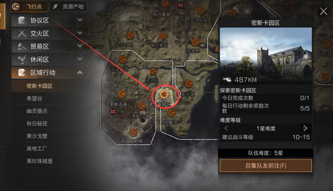 如下圖,組隊完成之后,隊長在中心出入口點擊【密斯卡園區(qū)】地圖,之后點擊召集隊友前往即可進入副本了。