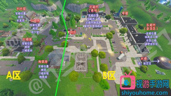 A區(qū)包括村長家,小破房,大破房,紅磚房,狗窩房,便利店以房區(qū)為主。B區(qū)包括,北超市(商場),東超市(雜貨店),電塔,水塔,狗窩房,便利店,紅磚樓以超市區(qū)域?yàn)橹鳌?其中紅磚房,狗窩房,便利店為共有區(qū)域)