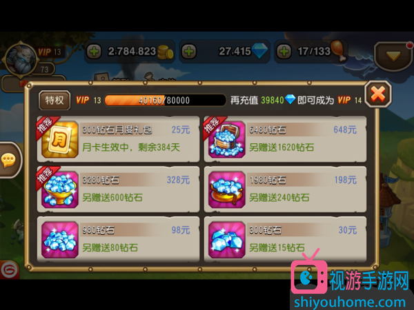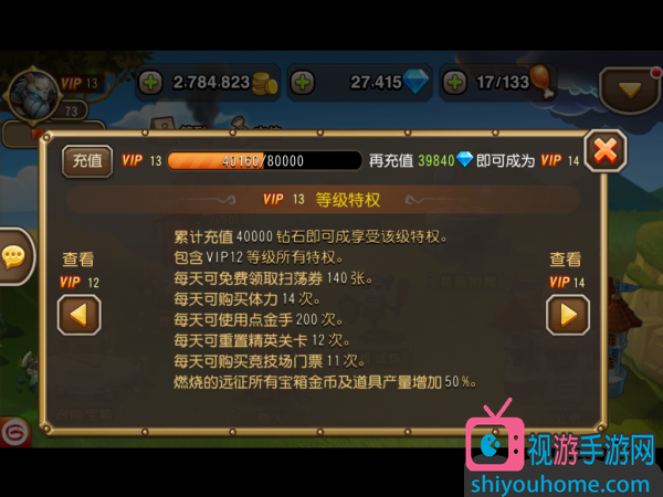 4, VIP13,累計(jì)充值鉆石,燃燒的遠(yuǎn)征所有寶箱金幣及道具產(chǎn)量增加50%。這樣每天的金幣收入可達(dá)230萬左右,非常富裕,而且遠(yuǎn)征如果掉落稀有的紫裝備或紫卷軸,數(shù)量也會提高50%,性價(jià)比也非常高。