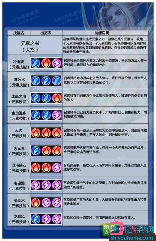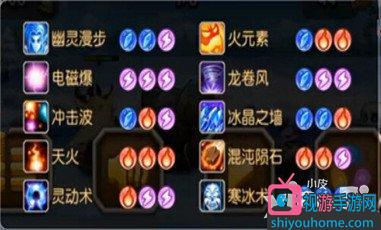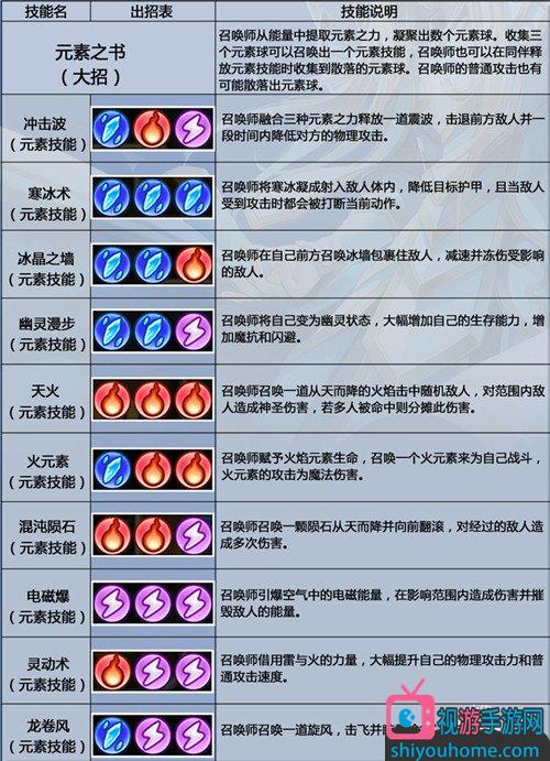 召喚師的大招“元素之書”會(huì)產(chǎn)出六個(gè)水、火、雷屬性的元素球。收集到3個(gè)元素球即可施展元素技能,召喚師共有10個(gè)元素技能。