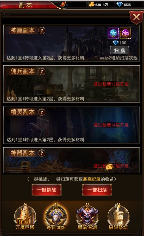 3)挑戰(zhàn)次數(shù)用完后,可花費(fèi)鉆石進(jìn)行掃蕩,提高SVIP等級(jí)可在呢個(gè)價(jià)掃蕩次數(shù)