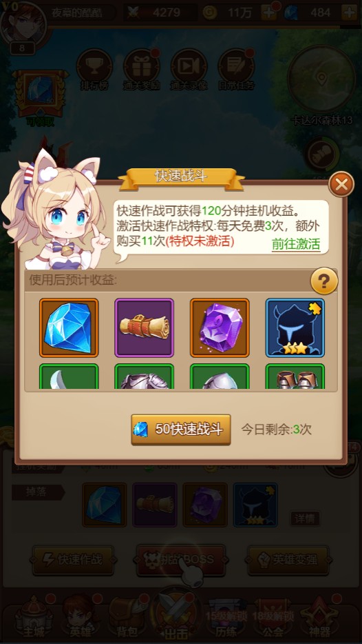 1、快速作戰可直接受益120分鐘當前關卡掛機獎勵
