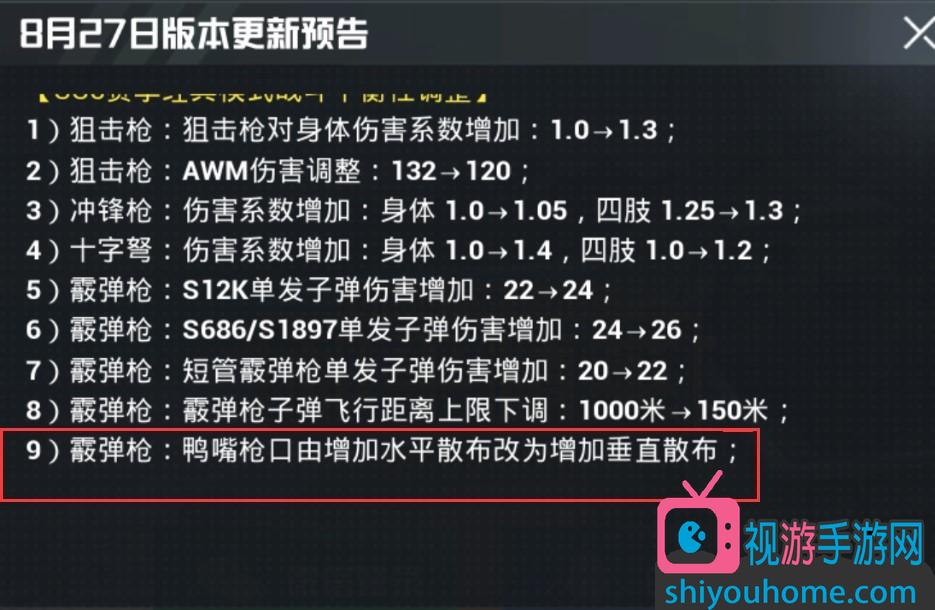 在目前的游戲中,特種兵可以使用四類霰彈槍,分別為S12K、S1897、S686和短管霰彈槍。其中,S12K的槍口配件除適配鴨嘴槍口之外,還適配突擊步槍的三類槍口配件,其槍口配件的選擇較多。S1897、S686和短管霰彈槍這三類霰彈槍適配霰彈槍專屬槍口配件——霰彈槍收束器。霰彈槍收束器可以降低霰彈槍子彈的擴散,讓霰彈槍的著彈點更加密集。此外,S1897霰彈槍還可以適配鴨嘴槍口。因此,霰彈槍的“鴨嘴槍口”配件屬性的調整主要會影響到S12K和S1897這兩把霰彈槍。