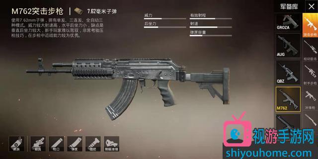 最后就是近期熱度暴漲的M762了,這把槍自從添加了全自動模式之后就受到玩家的關注,7.62子彈的槍械一般都是威力大射速不咋滴,但是M762不僅威力大射速還不錯,而且聲音還猛的一批,成了現在這個版本的寵兒。為何AKM和這把槍放在一起呢,因為AKM對于配件的要求很低而M762的配件要求卻很高所以兩把槍都有自己的優缺點。