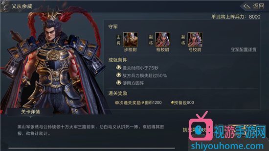 副將槍校尉用的也是三千兵力的槍兵,最后一個弓校尉用的是三千兵力的弓兵。玩家們通過關卡之后可以獲得一千二銅幣和六百預備役。我們通關兵力最少要八千,不然會打的比較費勁,如果你沒有達到還是先提升一下比較好哦,