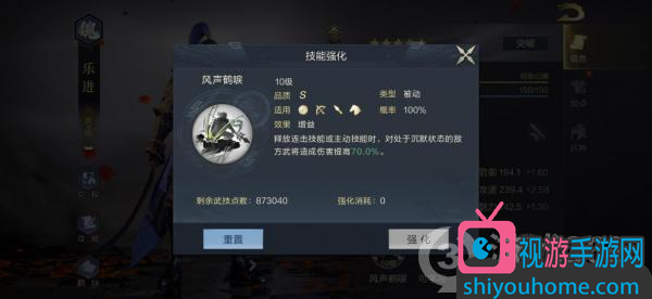 樂進(jìn)的武將專屬技能為“風(fēng)聲鶴唳”,效果為釋放連擊技能或主動技能時,對處于沉默狀態(tài)的敵人傷害提高最多70%。因此,這個技能可以配合其他武將攻擊的沉默效果使用,大幅提升樂進(jìn)的輸出能力。