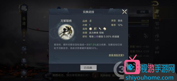 分解樂進(jìn)后的兌換武技為“萬軍取將”,同樣非常適合搭配沉默效果使用,進(jìn)而對敵方造成更加強(qiáng)力的武力傷害。