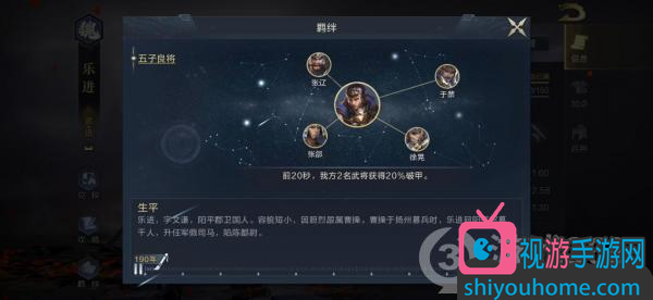 羈絆方面,樂進(jìn)唯一的羈絆就是和張遼、徐晃、張郃、于禁組成的“五子良將”,效果為,在戰(zhàn)斗前20秒,為我方兩名武將提供20%的破甲。因此在武將陣容搭配時,因重點考慮從“五子良將”的羈絆中尋找武將,配合技能的沉默效果,打出高額爆發(fā)傷害。