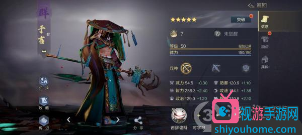于吉的定位是“智”,滿級智力達到了236.3,處在智力型武將第一梯隊。滿級魅力值210.8,同樣表現非常優秀。