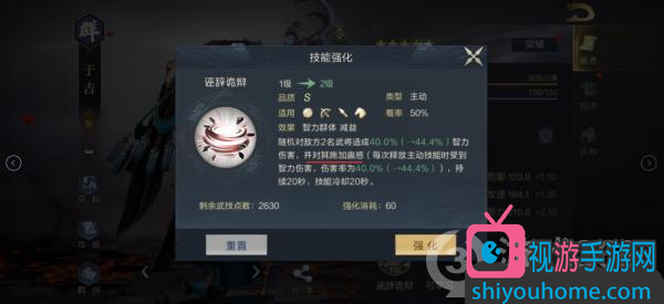 于吉的自帶武技“誣辭詭辯”為主動技能,發動概率50%,隨機對敵方2名武將造成智力傷害,并對其施加蠱惑,持續20秒。被蠱惑的目標每次釋放主動技能,將受到智力傷害。對于缺乏解控并以主動技為主的隊伍來說,“誣辭詭辯”可以讓對方非常難受。