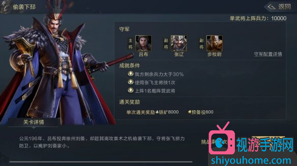 總結(jié):本關(guān)劇情武將是20級覺醒過的張飛,實力強勁。盡管對方有兩名五星名將,但基礎(chǔ)武將仍然可以全成就通關(guān)。