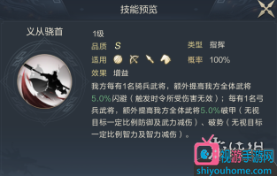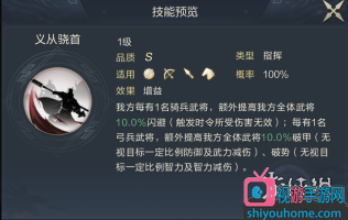 公孫瓚自帶的武技[義從驍首]對騎兵和弓兵有效。 我們每次有騎兵隊都能給我們全體武將一定的閃現。 如果有弓兵的話可以得到破甲。 效果可以根據有效人數疊加。 我屬于指揮技能。 開局一定要出發。 全程有效。