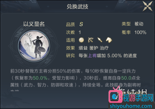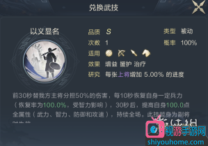 一級效果:前30秒為我們主將分擔50%的傷害,每10秒恢復自己的兵力(恢復率為50.0% )。 受智能影響),30秒后,提出自己的50.0點全屬性(武力、智能、防御、攻擊速度),繼續全場。 這個技能作為副將很有效。