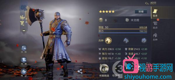 徐晃在游戲中的地位是“武”、“迅”。和大部分“武”系武將相似,徐晃的滿級(jí)武力和防御均破200,分別是236.5和214.5。而且其245.7的滿級(jí)攻速,說(shuō)明徐晃非常適合走連擊隊(duì)路線。