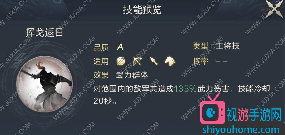 這一技能僅當曹洪身處主將位時才會生效,效果是對范圍內的敵方造成135%的武力傷害,技能冷卻20秒、