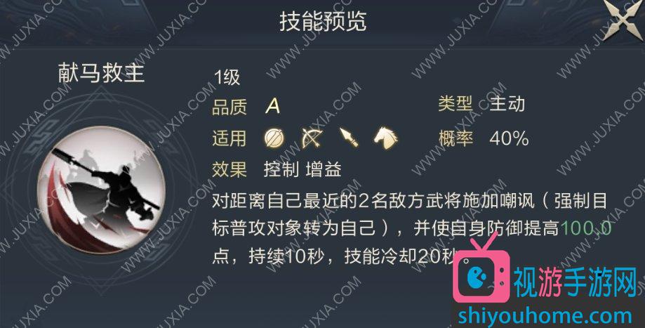 主動型技能,發動幾率40%,效果是嘲諷距離自身最近的2名敵方武將,目標的普攻對象在持續時間內只能選擇自己,同時提高自身100點防御值,持續10秒,冷卻時間20秒。