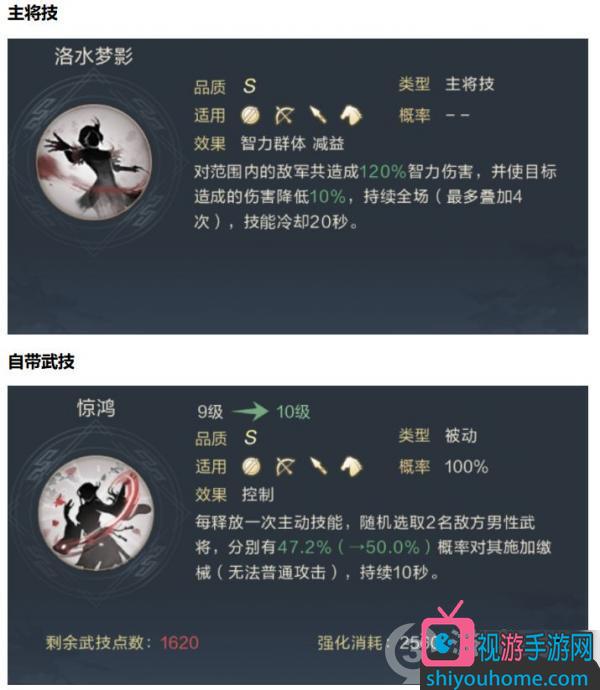 4.甄姬的特色技能,是S級被動技能“驚鴻”。作為一個被動技能,“驚鴻”的發動概率是100%。當甄姬每釋放一次主動技能,就可以隨機選取2名敵方男性武將,分別有25%概率對其施加繳械(無法普通攻擊),持續10秒。