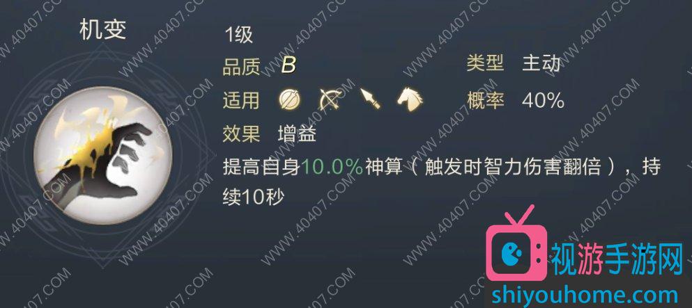 提高自身10%神算幾率(觸發(fā)時智力傷害翻倍),持續(xù)10秒,技能冷卻10秒