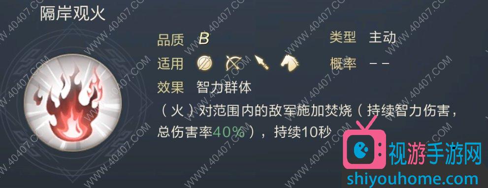 (火)對范圍內(nèi)的敵軍施加焚燒(持續(xù)智力傷害,總傷害率為40%),持續(xù)十秒。群體傷害技能,不過傷害并不高,各位玩家們可以放棄讓這個人物上場。