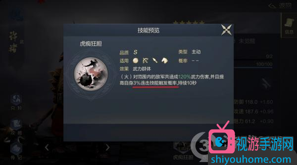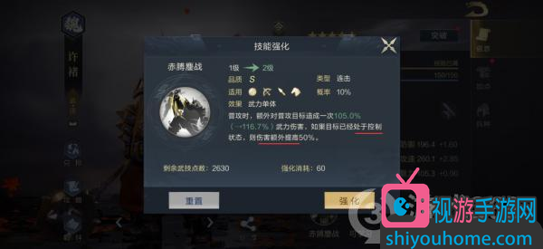 許褚的特色技能,是S級連擊技能“赤膊鏖戰”,發動概率是10%。“赤膊鏖戰”隨著普攻觸發,發動時可以對敵方武將造成武力傷害,如果敵方武將處于控制狀態,還會有額外的傷害加成。