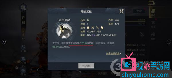 分解許褚能獲得S級連擊技“怒目退敵”。這是少有的能減少目標防御的連擊技,能大大提高武力系武技所造成的傷害,是連擊流武將用于大幅提升輸出的強力武技。
