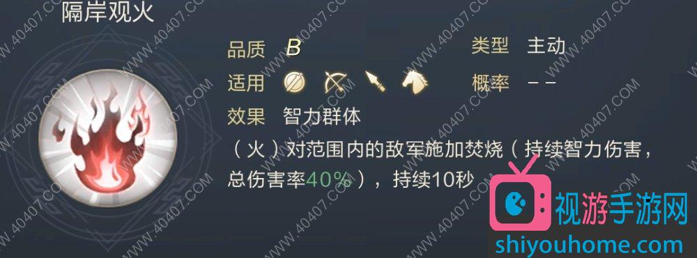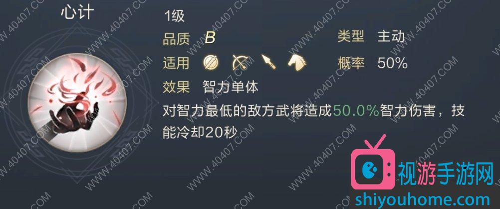 對智力最低的敵方武將造成50%智力傷害,技能冷卻20秒。同樣是一個輸出能力比較差的智力傷害,單點的,總的來說是不適合上場的。